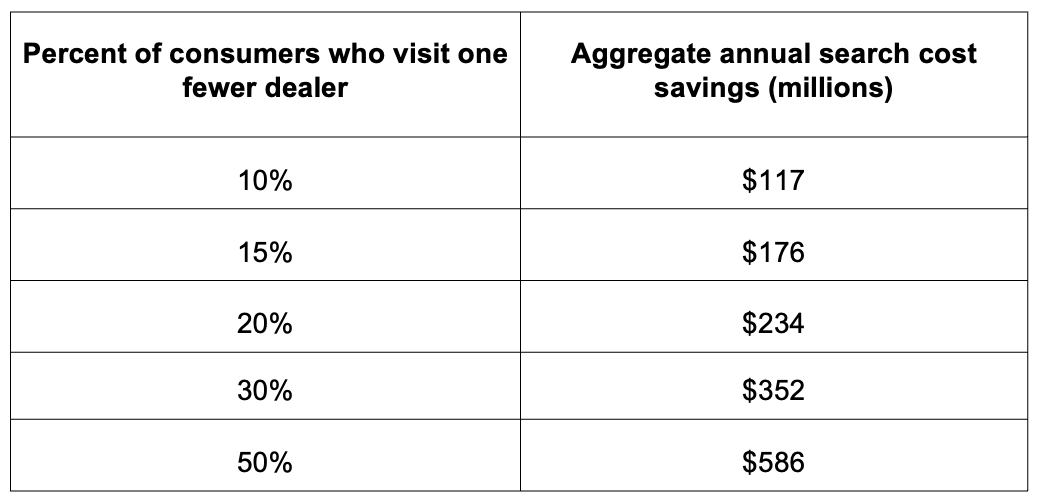 In our amicus brief, we calculate the savings from reducing search costs based on the estimates from Murry and Zhou (2020). To estimate the savings for the California market, we updated these calculations using counts of new and used car sales from CNCDA and for inflation using the CPI-U. We estimate that if the law resulted in 20 percent of consumers visiting one fewer dealer during their shopping process, it would yield aggregate search costs savings of $234 million per year. Estimates for other reductions in dealership visits are shown in the table below.